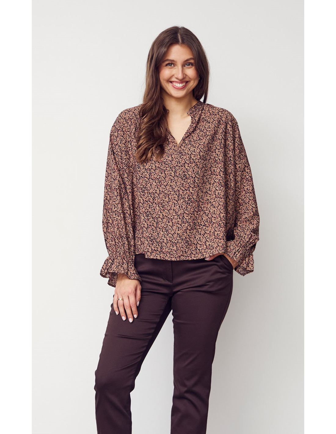 Ane Blouse är den perfekta kombinationen av kvinnlighet och komfort. Den höga halsen med smockdetalj ger en sofistikerad touch, medan raglanärmar och eleganta muddar ger blusen en exklusiv look. LENZING™ ECOVERO™ viskosmaterialet känns lätt och luftigt mot huden och är därför perfekt för både vardagsbruk och speciella tillfällen.