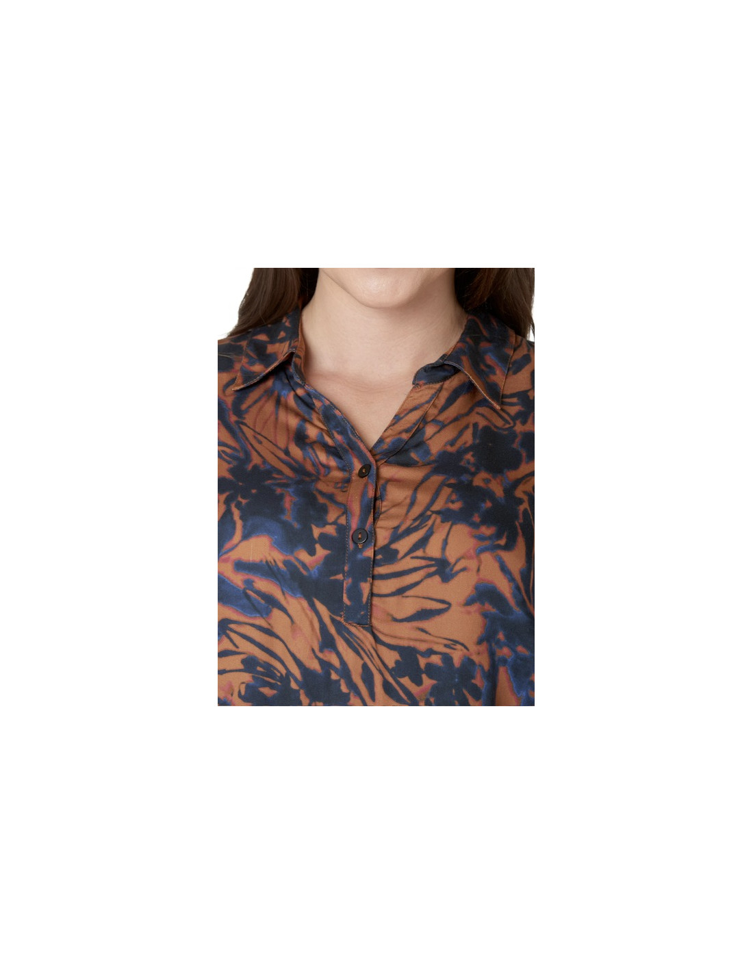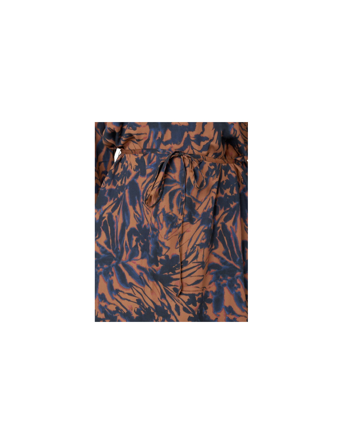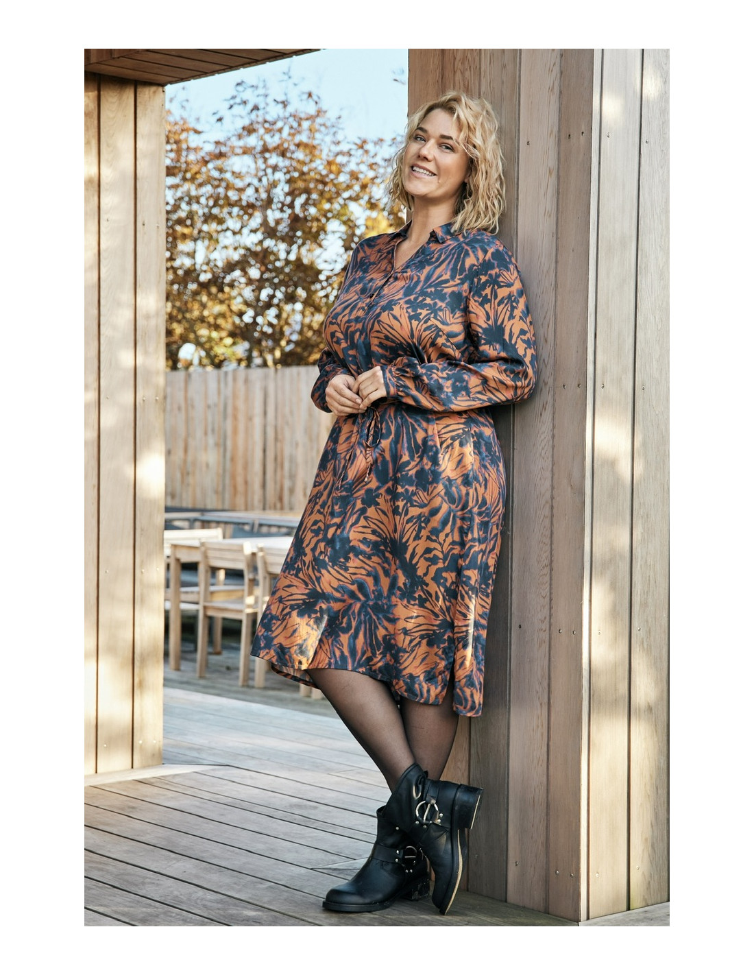 Snygg mönstrad klänning i viskos från Ciso. Den här klänningen är supersmart, med långa ärmar som stängs med en liten mudd och enkel knappstängning. Klänningen har en krage och knäppning framtill. Det finns ett avtagbart, smalt knytband i midjan, och på baksidan finns ett högt snitt med en skön rucheffekt. Klänningen har en kort slits i båda sidsömmarna. En vacker klänning för både vardag och fest. 100% viskos, 30 grader fintvätt, stryk ut efter tvätt