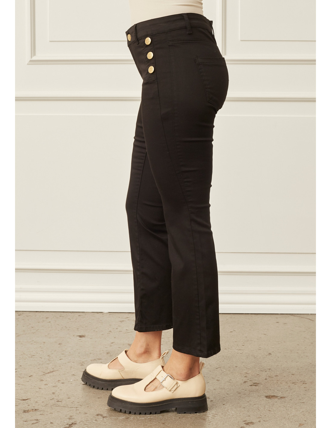 Lido Button Jeans är den ultimata vinnaren i garderoben med sina mycket unika egenskaper. Byxorna har en mellanhög midja, flare-effekt i benen och eleganta guldknappar på varje sida av höften, vanligtvis där fickorna är placerade. Lido Button Jeans har en fast linning med bältesögla och stängs med blixtlås samt guldknapp i mitten. Våra Lido Button Jeans har bakfickor men inga framfickor, vilket skapar den unika designen med tre guldknappar istället.